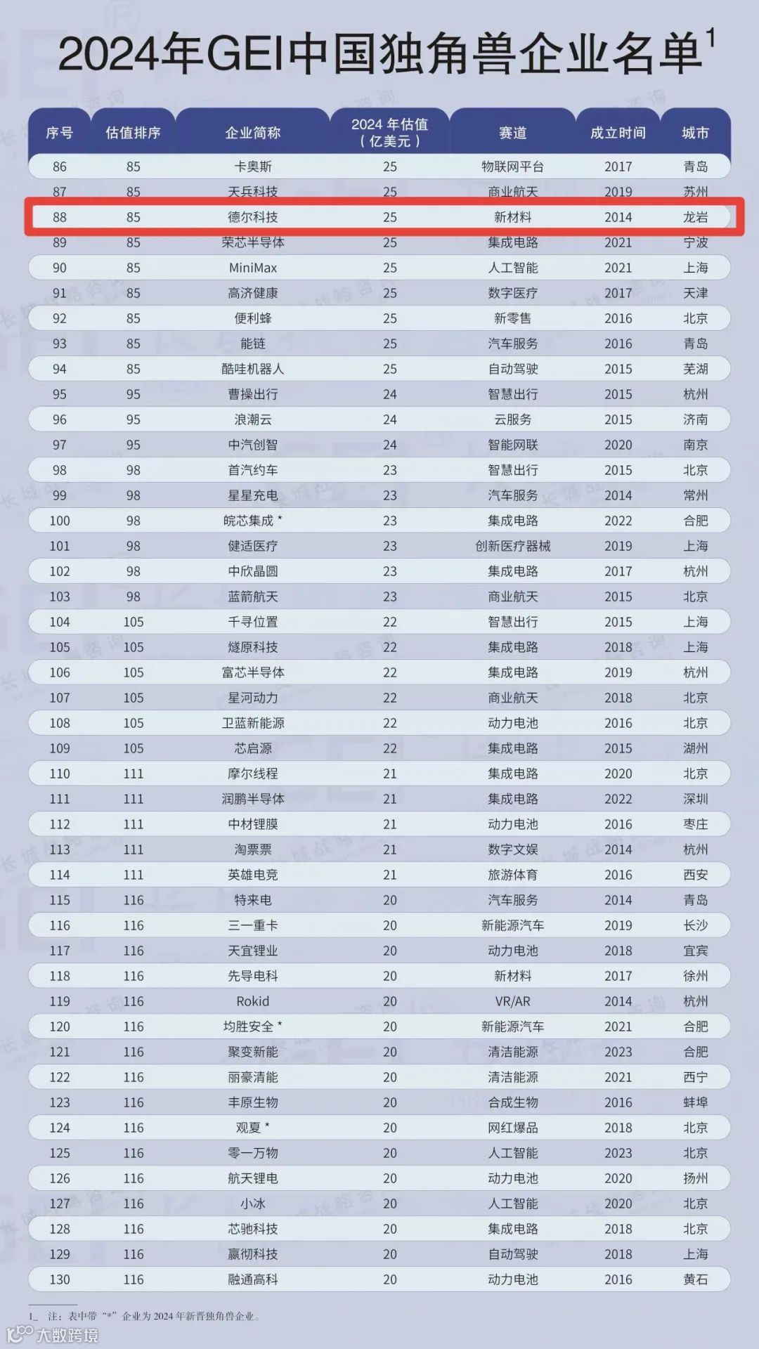 《2024年GEI中国独角兽企业榜单》正式发布,福建德尔科技股份有限公司凭借其在含氟电子材料领域系列重大创新突破和多个高端产业板块布局,根据独角兽高成长企业界定标准,成功入选并位列第88位,这也是继《2022福布斯中国新晋独角兽榜单》后又一次成功入选。