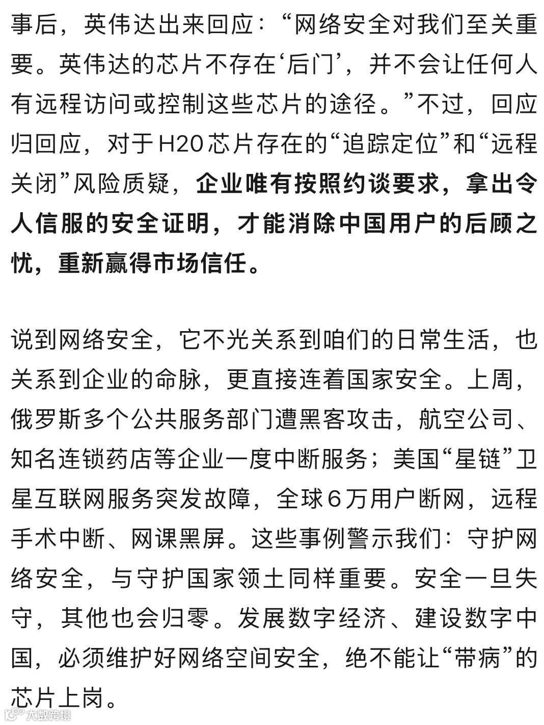 英伟达的算力芯片H20,被曝出存在严重安全问题,公司最近被国家网信办约谈。有人可能会问,这安全问题有多严重?可以设想这样的场景:高速公路上的新能源车,突然被切断动力;患者接受远程手术时,设备突然黑屏;超市收银台,手机的支付功能,瞬间失灵……芯片漏洞后门安全风险一旦触发,我们随时可能遭遇一场“噩梦”。