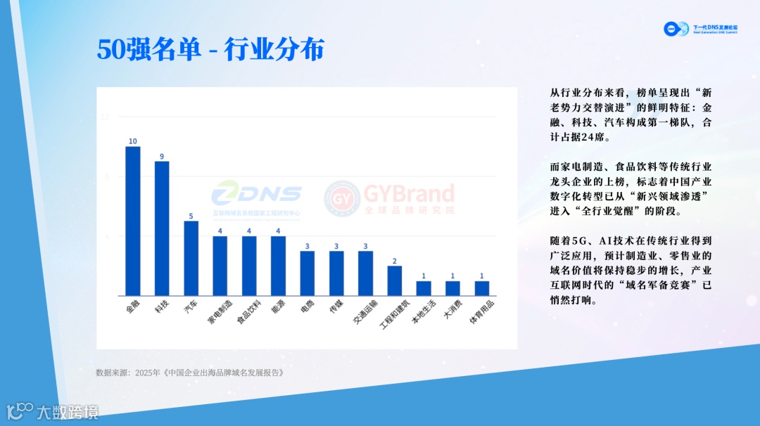 与此同时,家电制造、食品饮料等传统行业龙头首次规模化上榜,标志着中国产业数字化转型已从 “单点突破” 进入 “全行业觉醒” 的新周期。随着新一轮科技革命和产业变革深入发展,数字化转型加速,5G、AI 技术在传统行业得到广泛应用,这些行业的企业逐渐认识到品牌域名在拓展线上市场、进行文化输出等方面的重要性,开始积极布局域名战略,产业互联网时代的 “域名军备竞赛” 已悄然打响。