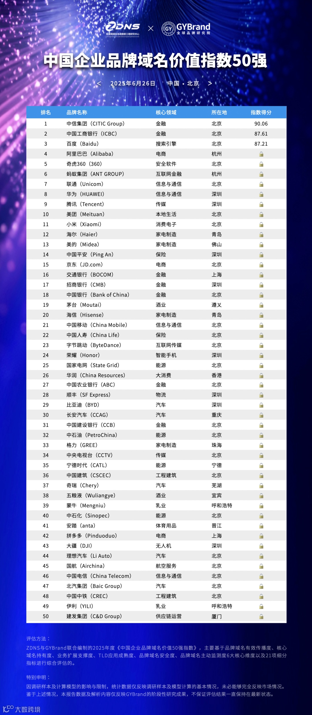 金融、科技、汽车三个高附加值领域构成第一阵营,合计占据榜单近半数席位(24席),凸显了数字经济的域名战略成熟度。金融行业企业由于其业务的特殊性,对域名的安全性和稳定性要求极高,在核心域名持有、安全防护等方面投入巨大;科技行业企业作为数字化浪潮的引领者,对域名的传播度、业务扩展支撑等方面有着深刻理解和积极实践;汽车行业在智能化、网联化转型中,也愈发重视品牌域名在定义智能生态标准方面的作用。