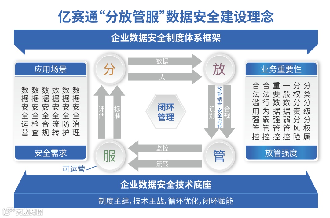 亿赛通针对数据全生命周期的多场景、高性能、智能化的安全治理需求,历经20余年的技术积累和上万个交付项目的沉淀,重点突破了端点数据自适应防护、海量数据内容审计、重要数据深度感知、敏感数据智能防护等关键技术,授权了50余项发明专利,达到了国际先进水平,提出了数据安全“分放管服”建设理念和数据安全治理智能化体系,自主研制了电子文档安全管理系统、数据泄露防护系统(含终端、网络、存储等)、API审计系统、数据库审计系统、数据库防火墙、数据库运维系统、数据脱敏系统(含动态和静态)、数据交换系统及文件防火墙等,覆盖了“云网端”等场景,构建了数据安全运营管理平台、数据安全态势感知平台及数据安全智能管理平台等。