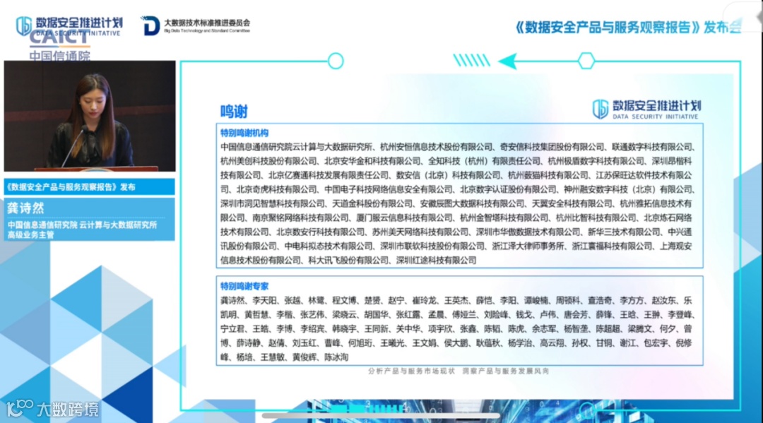 中国信通院云计算与大数据研究所高级业务主管龚诗然发布《数据安全产品与服务观察报告》,介绍了数据安全产品、服务、市场现状,阐述了基于图谱调研信息与多轮专家研讨形成的十项数据安全产品与服务观察观点。