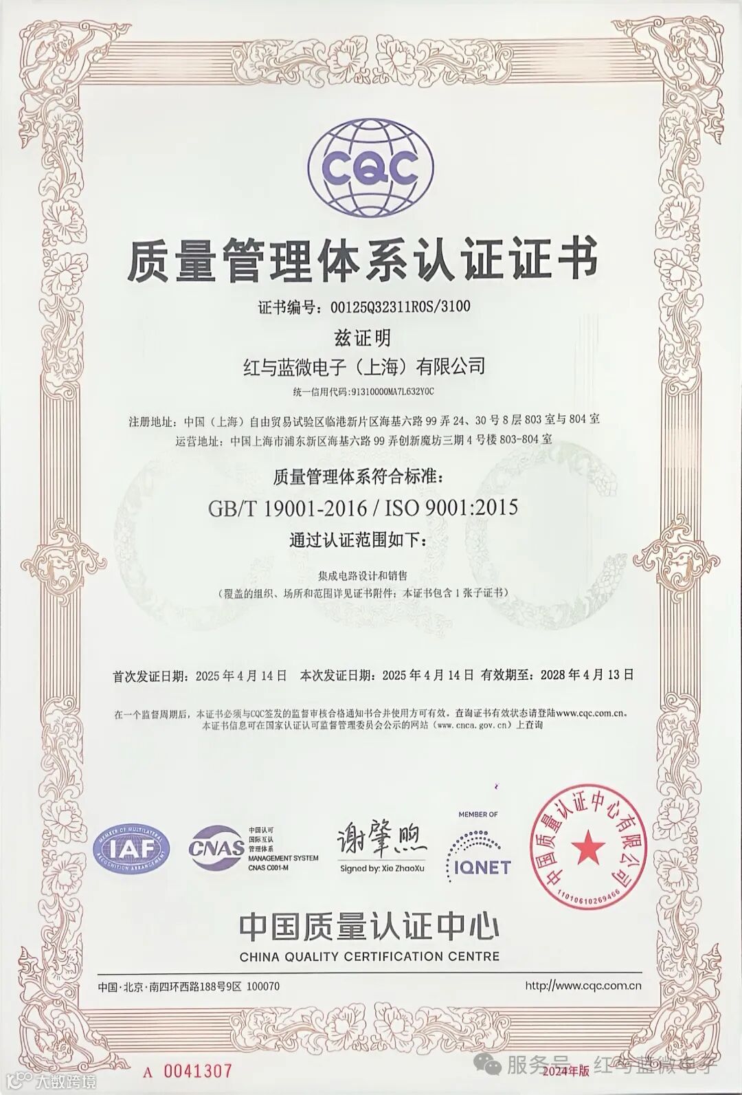 此次通过ISO 9001质量管理体系认证,不仅是对公司过往努力的肯定,更是对未来发展的激励。红与蓝微电子将持续优化质量管理数字化平台,深化全员质量意识,为全球客户提供更高可靠性、更强性能的微电子解决方案。