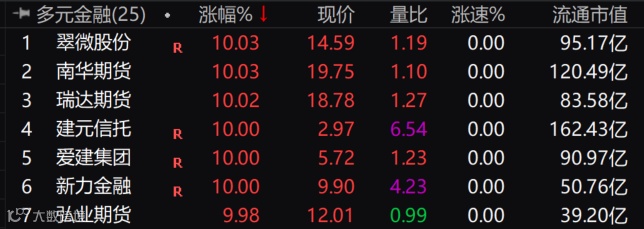 在板块方面,大金融走强,非银金融领涨两市,南华期货(603093)、国盛金控(002670)、天风证券(601162)、瑞达期货(002961)、湘财股份(600095)等近10只个股涨停或涨超10%。