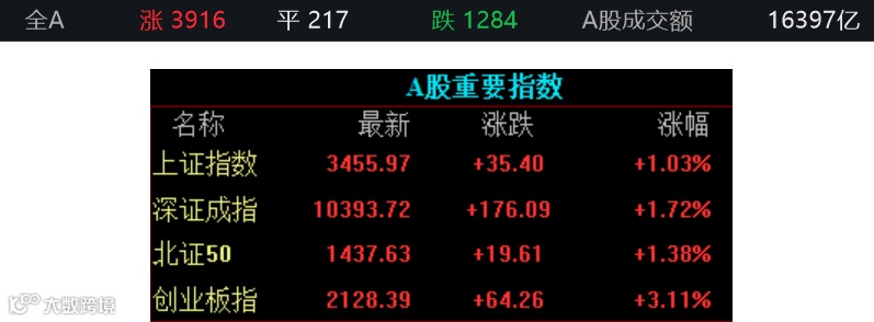 两市成交额达1.6万亿,全市场近4000只个股上涨。据统计,两市及北交所共有96只股票涨幅在9%以上,6只股票跌幅在9%以上。