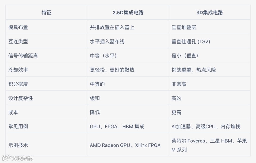 2.5D IC 将芯片并排排列在中介层上;3D IC 则垂直堆叠芯片。
