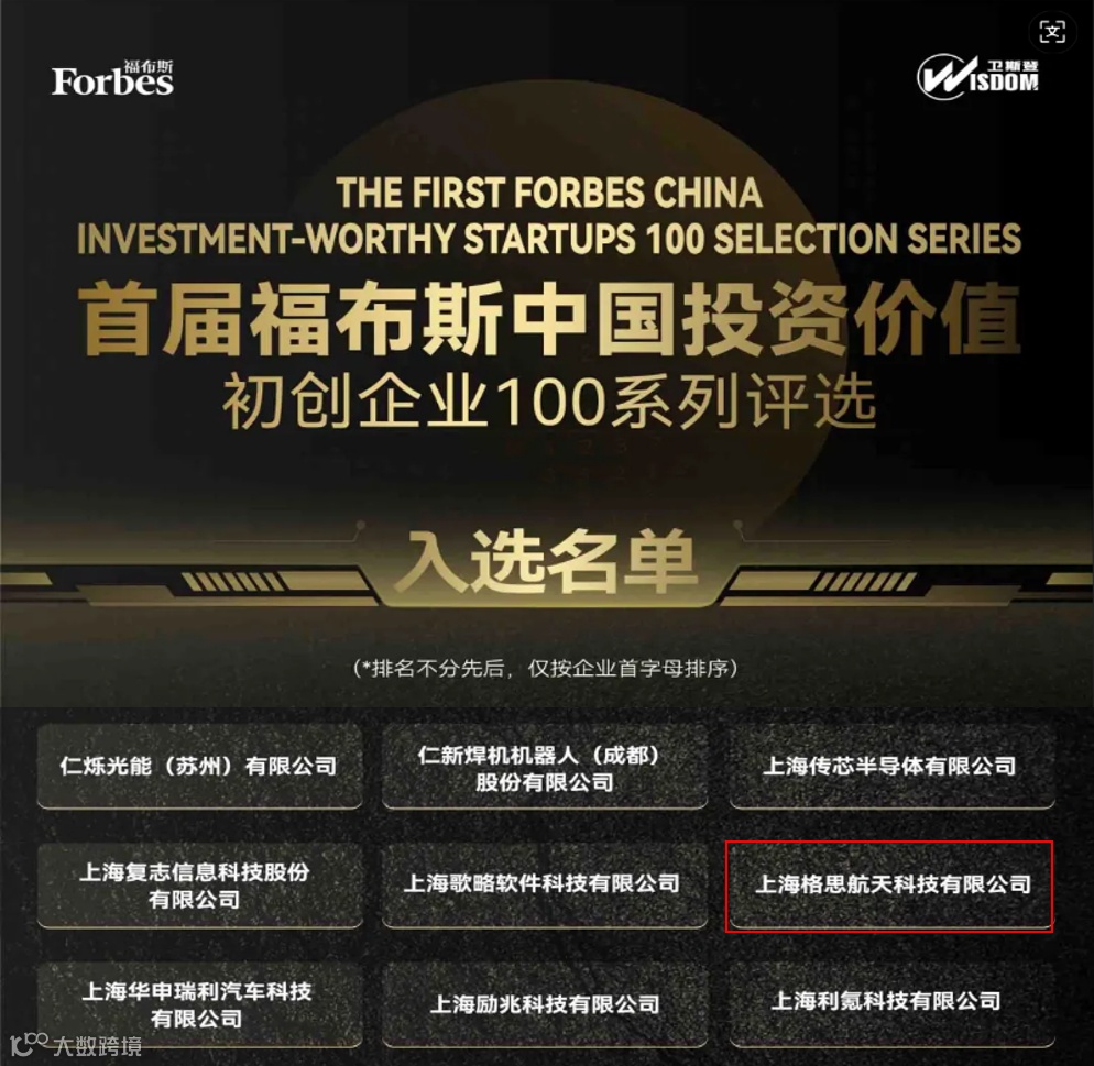 4月7日,首届福布斯中国投资价值初创企业100系列评选结果揭晓,上海格思航天科技有限公司成功入选该榜单。