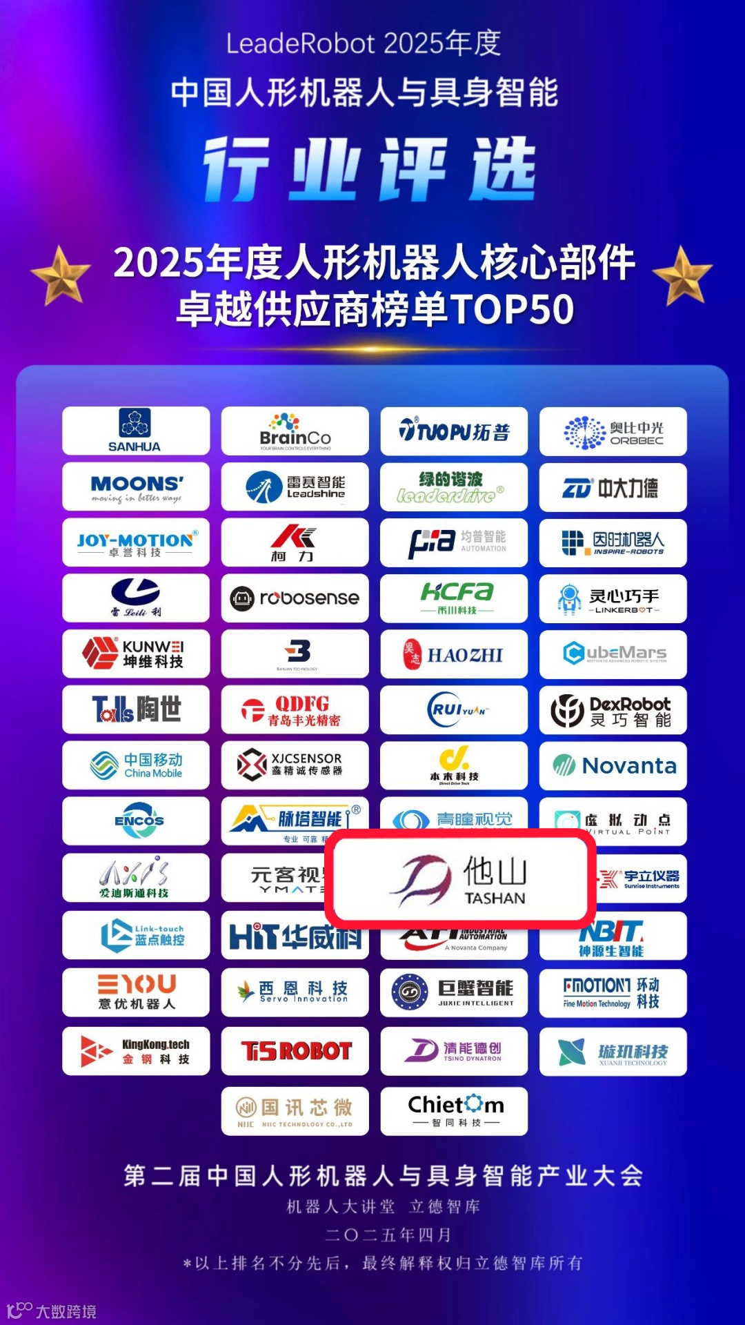 2025年4月15日,第二届人形机器人与具身智能产业大会在北京隆重开幕。他山科技凭借在触觉感知技术领域的卓越创新与高质量合作,荣获“LeadeRobot2025年度人形机器人技术合作奖”。