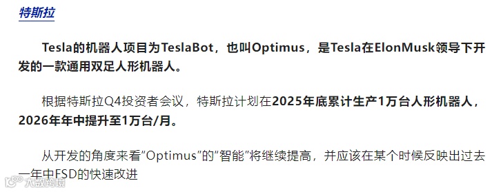 随着AI技术的普及以及特斯拉人形机器人Optimus的持续完善,预计全球人形机器人的量产以及商业化进程将持续推进。