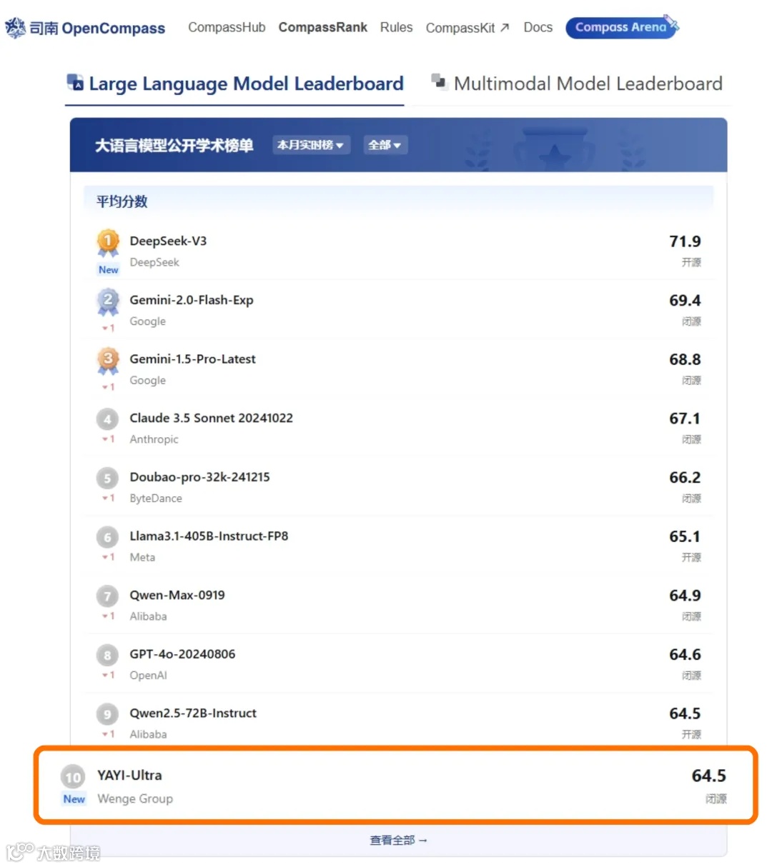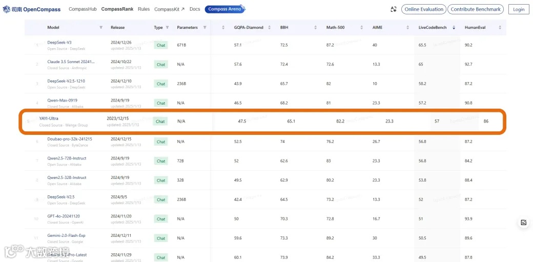 OpenCompass大语言模型公开学术榜 Top10