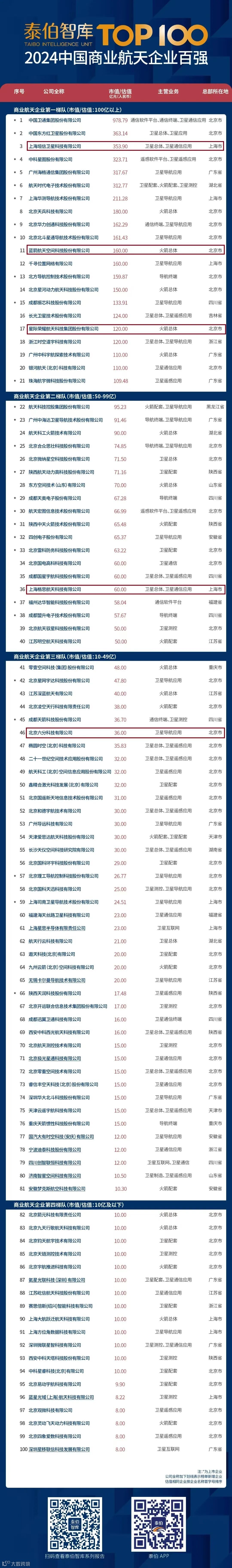 【关注】新鼎资本多家已投企业荣登泰伯智库2024中国商业航天企业百强榜单