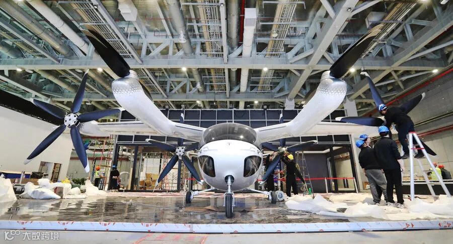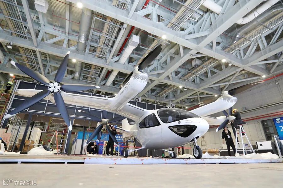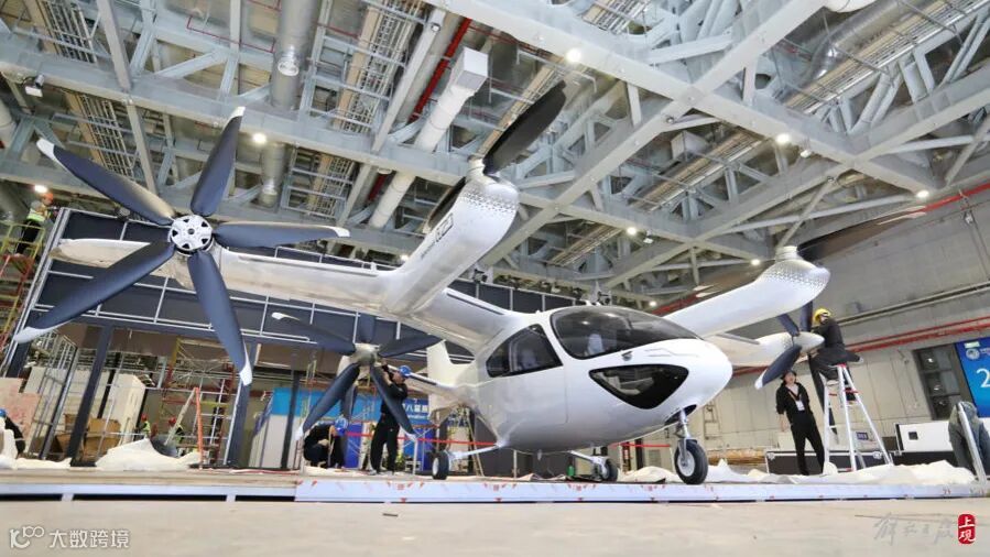 E20倾转旋翼载人电动垂直起降飞行器,在2.1馆低空出行展区TCab Tech时的科技展台安装。