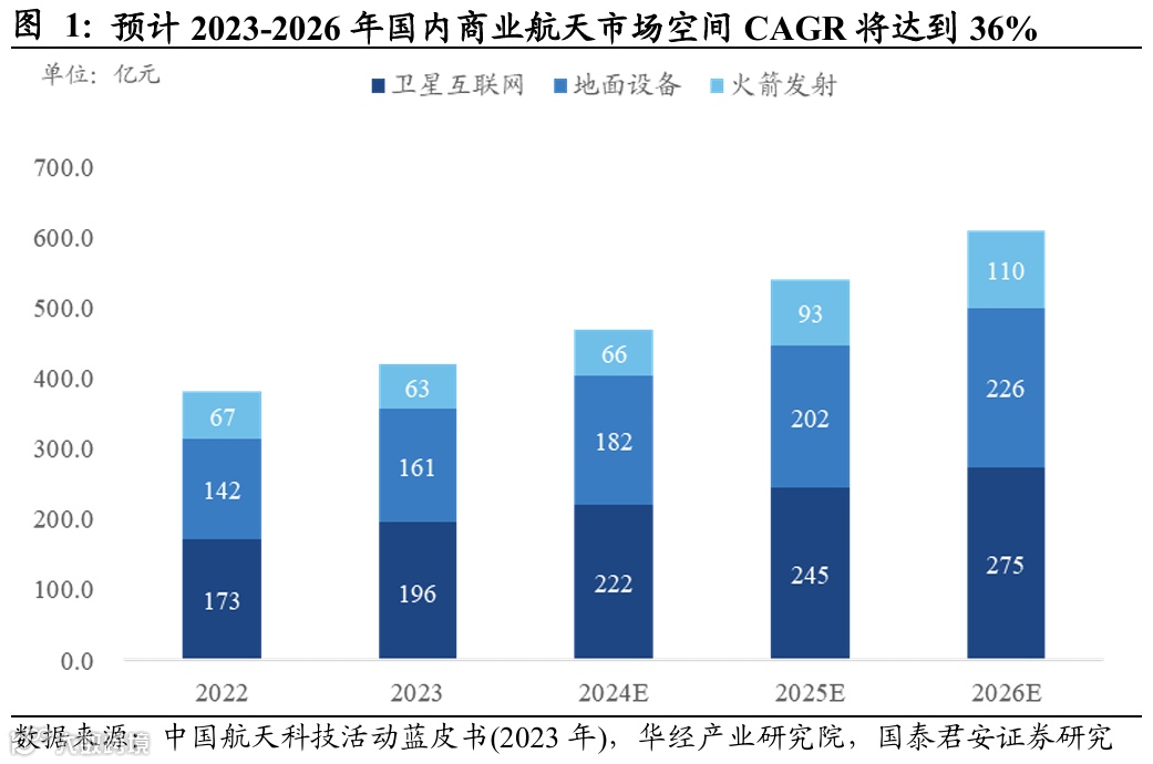 2023年商业航天市场规模为420亿,预计到2026年市场规模为610亿,对应三年复合年增长率为35.72%,中国商业航天市场空间广阔。