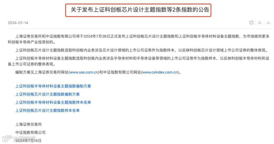 7月14日,上交所和中证指数公司联合发布公告称,将于7月26日正式发布上证科创板芯片设计主题指数和上证科创板半导体材料设备主题指数。