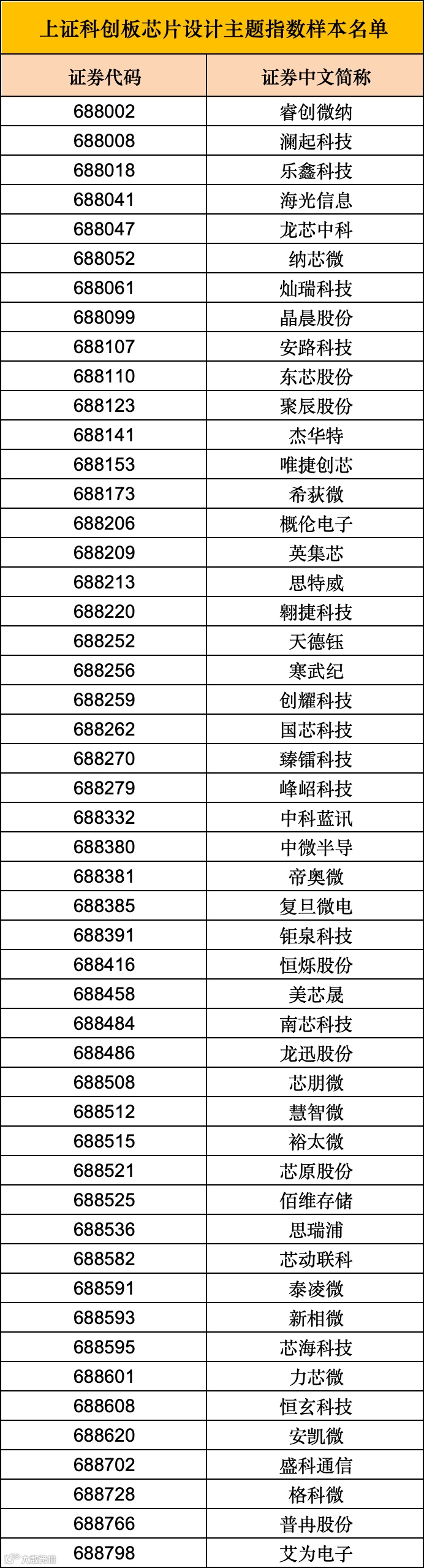 还有上证科创板芯片设计主题指数,选取了科创板内业务涉及芯片设计领域的上市公司证券作为指数样本,以反映科创板芯片设计领域上市公司证券的整体表现。具体来看,包括睿创微纳、澜起科技、乐鑫科技、海光信息、龙芯中科等50只样本股。
