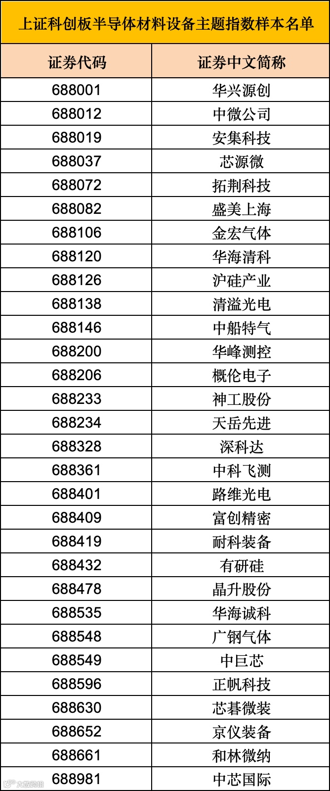 此次将要推出的上证科创板半导体材料设备主题指数,选取了科创板内业务涉及半导体材料和半导体设备等领域的上市公司证券作为指数样本,以反映科创板半导体材料和设备上市公司证券的整体表现。具体来看,包含华兴源创、中微公司、安集科技、芯源微、拓荆科技等30只样本股。