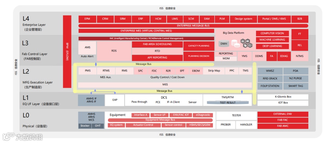 以芯享科技合作过的某头部半导体工厂的信息化架构为例,一般包含:企业管理层(决策层)-控制层-生产制造层-设备接口层-设备层,其中企业管理层由ERP等系统构成,生产制造层由MES、WMS等系统或平台构成,设备接口层由EAP等系统构成。