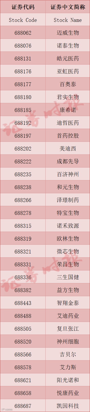 上证科创板创新药指数样本: