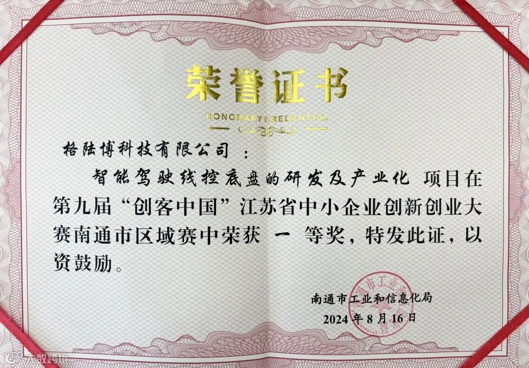 8月9日,由南通市工业和信息化局主办的第九届“创客中国”2024江苏省中小企业创新创业大赛南通市区域总决赛正式举行。格陆博科技CFO吴辉祥出席了第九届“创客中国”南通市区域赛,并就“智能驾驶线控底盘的研发及产业化”方案发表了主题演讲,详细介绍了格陆博科技智能线控底盘的整体解决方案。经过多层激烈角逐,格陆博科技“智能驾驶线控底盘的研发及产业化”项目脱颖而出,荣获南通市一等奖。