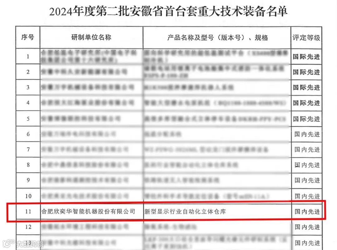 近日,安徽省工业和信息化厅公示了安徽省2024年第二批安徽省首台套重大技术装备名单,合肥欣奕华新型显示行业自动化立体仓库成功通过认定获评。至此,合肥欣奕华已收获7项安徽省首台套技术装备产品认定。 在工业领域,首台套是装备制造业实现高端突破的标志。据了解,首台套重大技术装备是指经过创新,其品种、规格或技术参数等有重大突破,具有知识产权但尚未取得市场业绩的首台套或首批次的装备、系统和核心部件,具有价值量大、创新性强、研制风险高等特点。合肥欣奕华的新型显示行业自动化立体仓库正是装备制造业领域中的高新前沿技术产品。