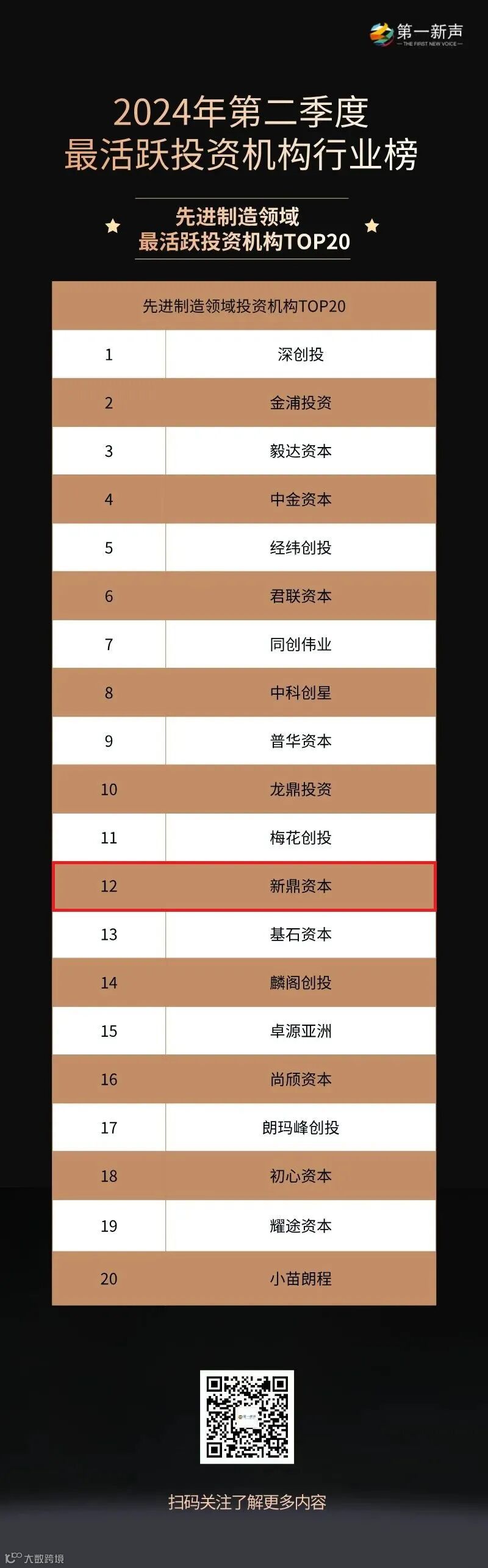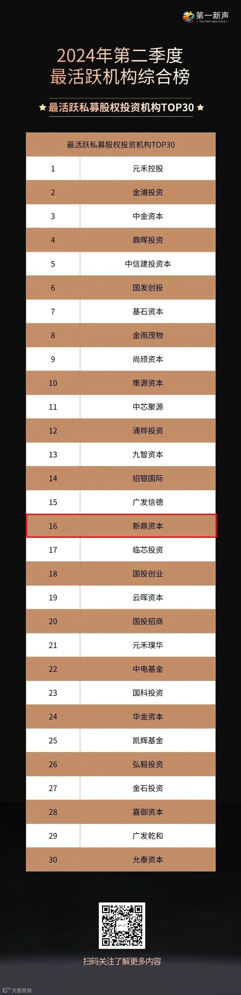 2024年8月15日,第一新声发布了投资中国:2024年Q2中国最活跃机构系列榜,新鼎资本凭借过硬的投资实力,荣登两大榜单: