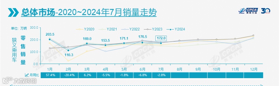 数据显示,7月全国乘用车零售销量为172.0万辆,同比下降2.8%,环比下降2.6%。其中,传统燃油车零售销量为84万辆,同比下降26%,环比下降7%。