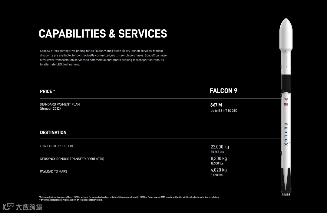 猎鹰9号拼车服务(F9-Standard Commercial):拼车服务按照官网报价单发火箭6700万美元来进行测算。 -