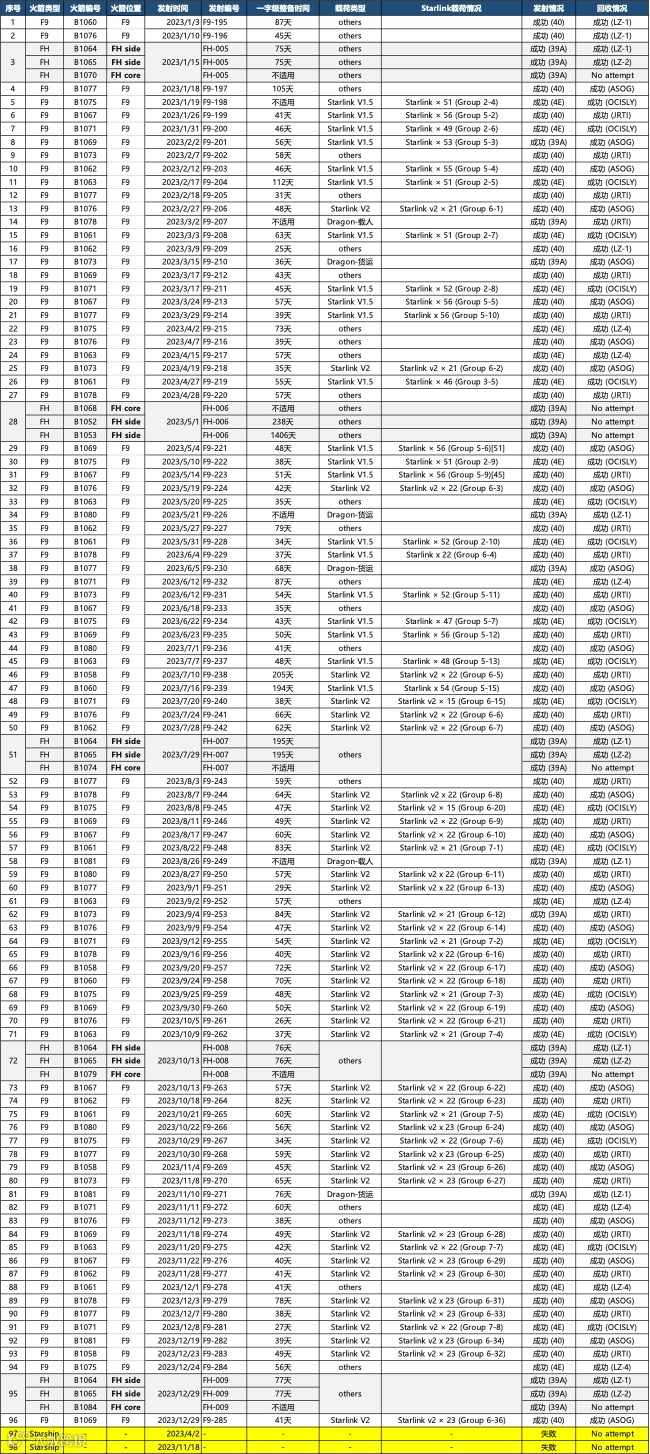 猎鹰9号-Starlink卫星发射部署的共计63次。 -