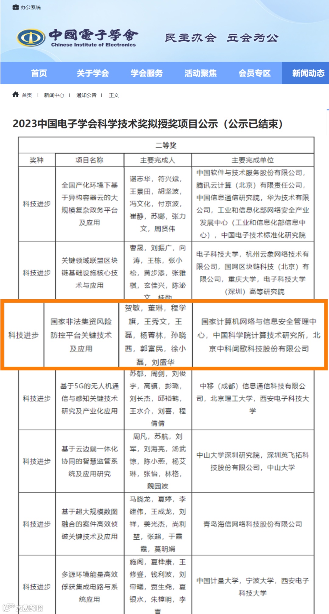 近日,中国电子学会公布“2023年中国电子学会科学技术奖”名单,中科闻歌与国家计算机网络与信息安全管理中心、中国科学院计算技术研究所联合完成的“国家非法集资风险防控平台关键技术及应用”项目荣获2023中国电子学会科学技术奖科技进步二等奖
