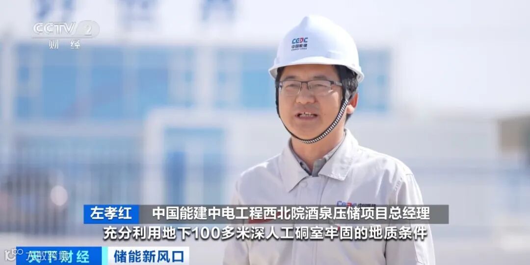 中国能建中电工程西北院酒泉压储项目总经理 左孝红:充分利用地下100多米深人工硐室牢固的地质条件,储存超大容量的常温高压空气。相比盐穴压缩空气储能电站,人工硐室的储能容积扩展不受限制,系统压力、温度等参数也可以提高一倍以上。