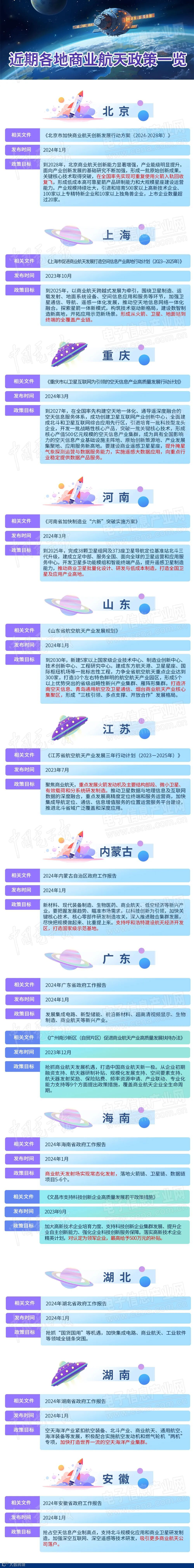 商业航天作为极具挑战性的高新技术领域,具有高技术、高风险、高效益和长周期等特点,能够充分发挥民营效率优势,构建上下游产业供应链体系,促进相关产业协同发展。近年来我国商业航天发展迅速,这离不开全国各地相关政策的大力扶持,《中国电子报》梳理近期各地支持商业航天发展的政策文件,呈现地方发展重点,供业界参考。