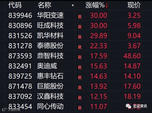 ”今天北交所的市场做多情绪飙升,市场表现红透整个大A。”资深新三板评论人、北京南山投资创始人周运南介绍,首先,北A上演30cm涨停秀,华阳变速、凯华材料和旺成科技先后强封涨停,特别是凯华材料分别从上周三到今天共4个交易日,共现了3个涨停;第二,北A个股涨幅霸屏整个大A市场,今天大A涨幅榜前四均为北A公司。