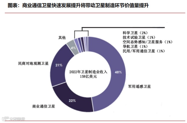 2022年全球卫星制造业收入158亿美元,在卫星产业总收入中占比为5.6%,同比增长15.5%。其中美国卫星制造业收入56亿美元,较2021年减少6亿美元,占比为 64.6%,其商业卫星制造收入增长了45%,政府卫星制造收入增长34%。我们认为,随着 starlink等低轨通信卫星大规模批量化发射,商用通信卫星制造收入增长,带动卫星制造环节的价值量占比提升。