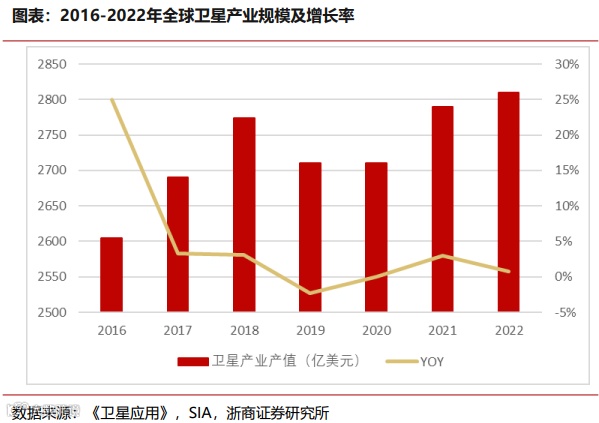 全球卫星产业规模保持稳定增长, 根据SIA数据,2022年全球卫星产业收入2810亿美元,比2021年增长了20亿美元。从结构上看,卫星服务业和地面设备制造业占据主要价值量环节,二者 占比卫星产业价值量90%+。
