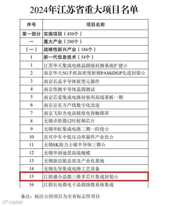 近日,江苏省发展与改革委员会发布2024年江苏省重大项目名单,盛合晶微半导体公司三维多芯片集成封装项目连续2年入选,并被列为全省标志性项目。