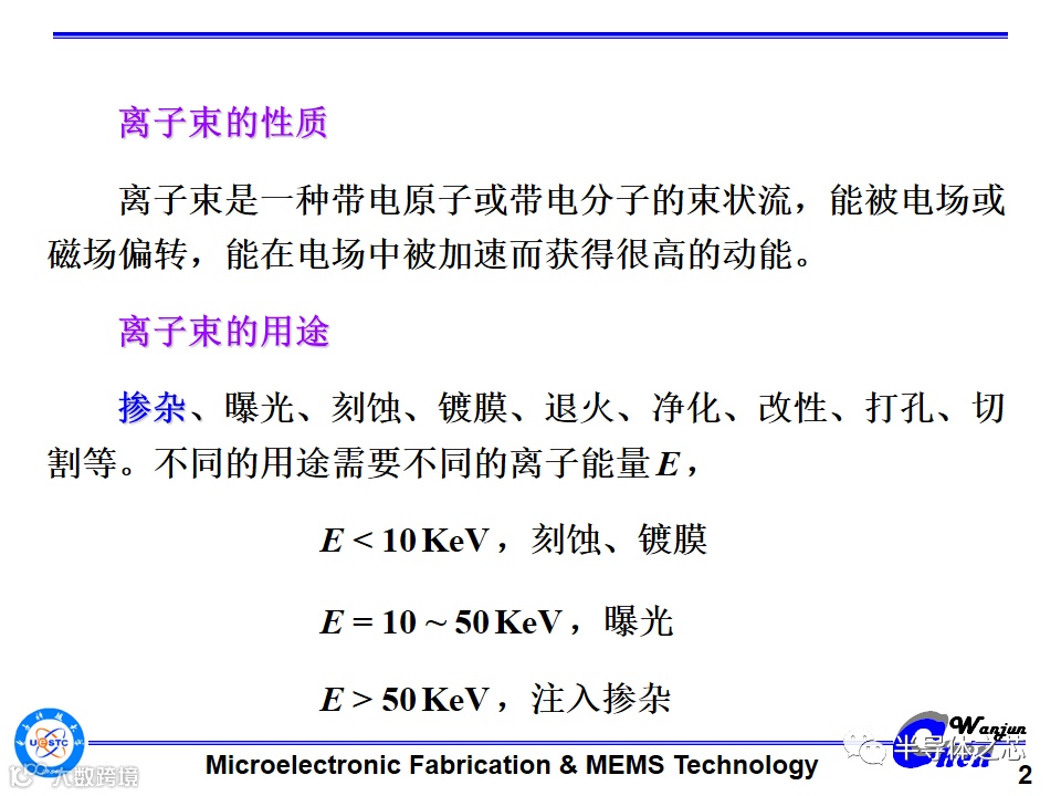 对于主要用于阱区与深埋层注入过程的高能离子注入机,需要将数个高压加速电极沿着射线方向串联在一起,这样可以将离子加速到几百万电子伏(MeV)的能量等级。应用在超浅型结(USJ)注入的离子注入机,特别是用于Р型硼的注入,后段加速电极以反向方式连接,这样离子束才会在经过该电极时被减速而不是被加速,产生能量低于0.1keV左右的纯净离子束。
