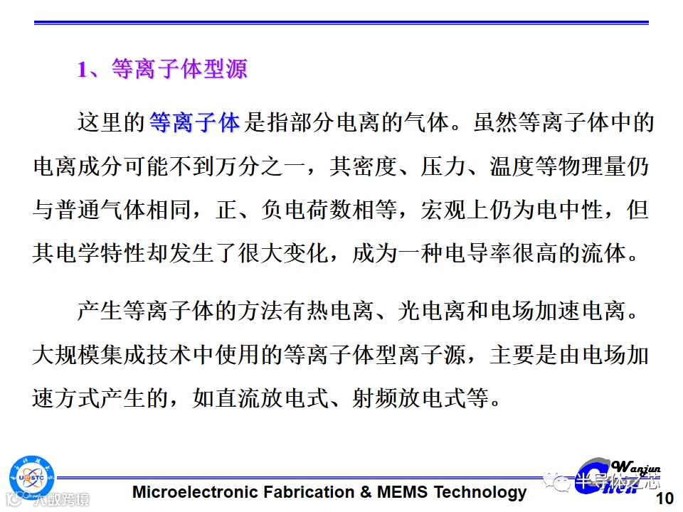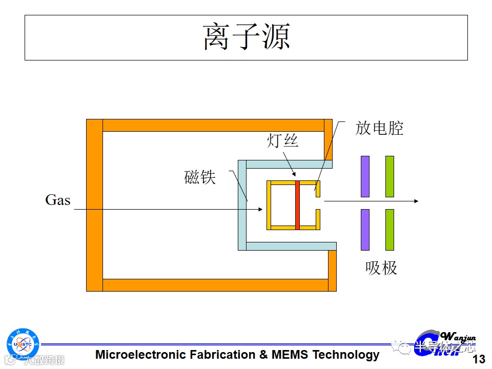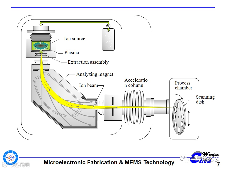 在等离子体注入系统中,热电子从热的钨丝表面发射出来并通过直流电源加速。这些热电子将在反应室中与中性原子碰撞产生带有电子与离子的等离子体。等离子体中的电子会被吸入离子束中与离子一起流向晶圆表面,形成的等离子体将中和晶圆并将晶圆的带电效应降到最低。