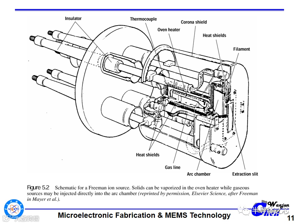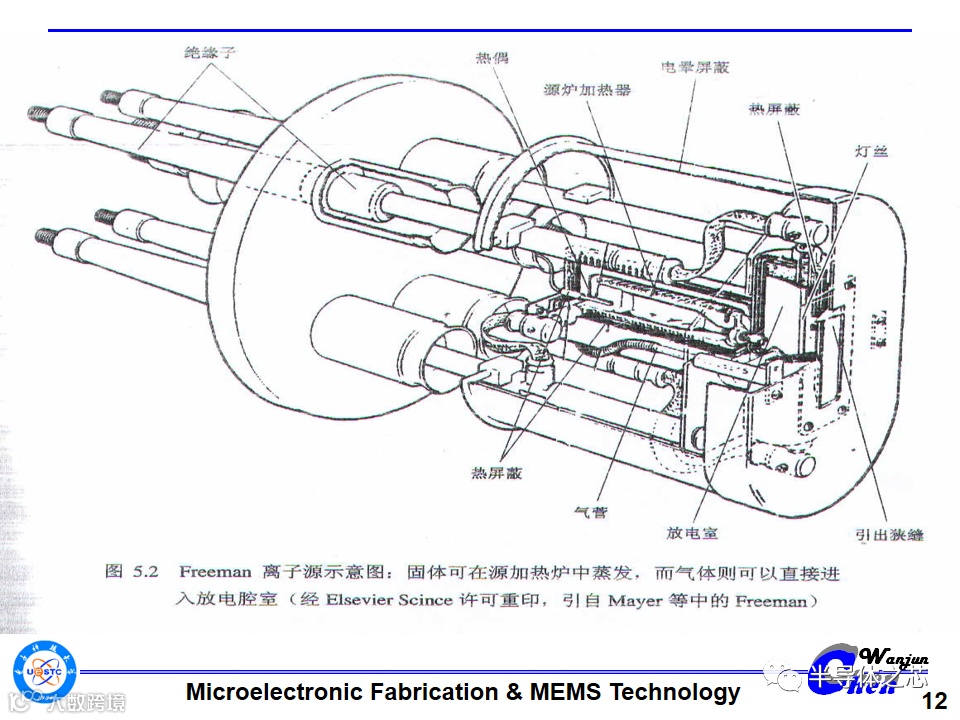 图8.21显示了一个热灯丝离子源。离子源内的磁场将强迫电子形成螺旋运动,这将使电子行走更长的距离,并增加电子与掺杂物分子碰撞的概率而产生更多的掺杂物离子。负偏压抗阴极电极板会将电子从附近的区域排斥,减少了电子沿磁场线与侧壁产生碰撞的损失问题。