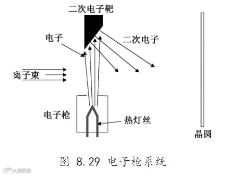 图8.29说明了一个电子枪系统。热电子由热灯丝产生并以高能量加速到电子靶上。电子与靶碰撞后产生大量二次电子,这些二次电子由靶的表面通过撞击离开表面后与离子束一起流向晶圆中和晶圆表面的正离子。