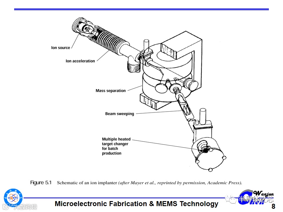 某些注入机后段加速之后,将用一个电极将离子束弯曲一个小角度,例如10°,从而有助于摆脱高能量的中性粒子。当离子的轨迹弯曲并向晶圆移动时,中性粒子保持直线运动(见图8.26)。有些注入系统将离子弯曲两次,并形成「S」形轨迹,这样可以获得纯度更高的离子源。