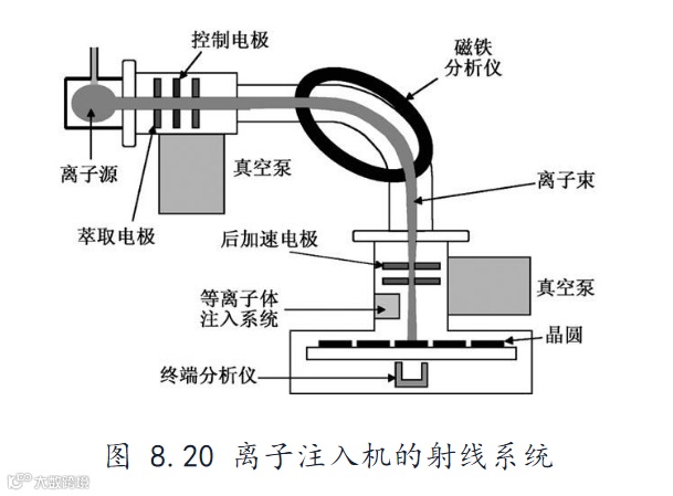 离子射线系统是离子注入机最重要的部分,它包含了离子源、萃取电极、质谱仪、后段加速系统、等离子体注入系统及终端分析仪。图8.20说明了离子注入机的射线系统。