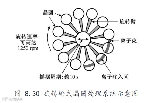 对于旋转轮系统,旋转轮能高速自旋。当晶圆通过离子束时,离子会以离子束的弧形带状形式注入到晶圆的部分区域。转轮的中心会前后摆动,从而可以使离子束均匀地扫描到旋转轮的每个晶圆部分。图8.30说明了一个旋转晶圆的支撑系统。