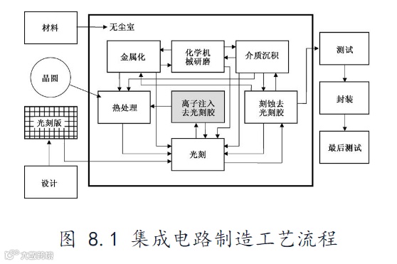 离子注入是一种添加工艺,利用高能量带电离子束注入的形式,将掺杂物原子强行掺入半导体中。这是半导体工业中的主要掺杂方法,在集成电路制造中一般用于各种不同的掺杂过程。图8.1 显示了集成电路制造过程中的离子注入工艺与其他工艺的关系。