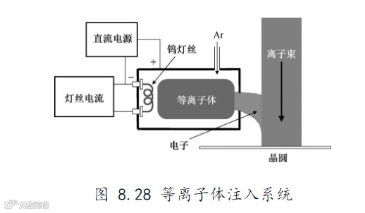 为了处理晶圆带电问题,需要使用大量带负电荷的电子中和晶圆表面的正离子。有几种方法可以使晶圆中性化:等离子体注入系统、电子枪和电子淋浴器都可以提供电子中和正离子,将晶圆的带电效应降到最低。图8.28显示了一个等离子体注入系统。