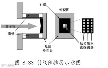 图8.33说明了一个射线阻挡器。离子束阻挡器的底部有一个离子检测器列阵,可以用来测量离子的能量与能量光谱、射束的电流和射束形状。离子束中有很多电子,这些电子主要来源于电荷中性化系统,例如电子注入系统、电子枪或其他可产生大量电子的电子源。如果这些电子进入射线阻挡器并碰撞到法拉第检测器时,就会减小电流的读数值,影响射束电流测量结果的准确性。因为电子的螺旋转动半径较小,所以利用永久磁铁产生磁场防止电子进入射束阻挡器中。磁场也可以防止石墨表面发射的二次电子进入后段加速电极中造成损坏。