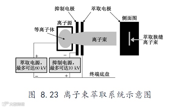 使用负偏压的萃取电极将离子从离子源内的等离子体中抽出,并将其加速到大约50keV的能量。离子必须有足够的能量才能通过质谱仪磁场选择出正确的离子。图 8.23显示了萃取系统。当掺杂物离子加速并射向萃取电极时,一些离子会通过夹缝并继续沿着射线行进;一些离子会碰撞到萃取电极的表面产生×光并激发出二次电子。一个电位比萃取电极低很多(最多10kV)的抑制电极将会用于防止二次电子被加速返回离子源造成损坏。所有的电极都带有一个狭窄的狭缝,这个狭缝使离子萃取出来作为准直式离子流并形成所需的离子束。
