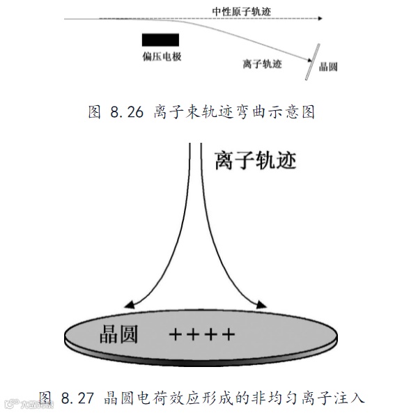 当离子注入进入硅衬底时,会将正电荷带入晶圆表面。如果正电荷一直积累,就可能造成晶圆的带电效应。带正电荷的晶圆表面将倾向于排斥正离子,这样将引起所谓的射线放大和不均匀的离子注入,并导致整个晶圆上的掺杂物分布不均匀(见图8.27)。