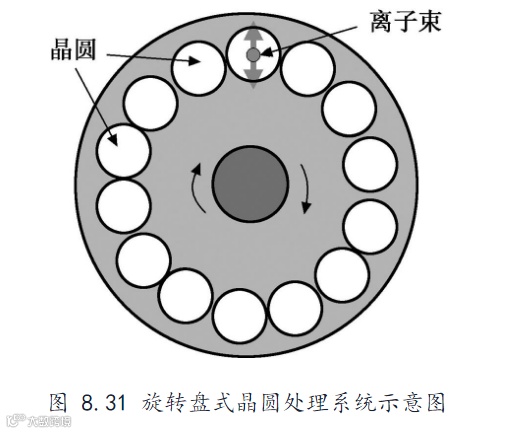 旋转圆盘与旋转轮类似,不同之处在于旋转圆盘不是摆动整个圆盘,而是用扫描离子束的方式在整个晶圆表面获得均匀的离子注入。图 8.31说明了旋转圆盘系统。