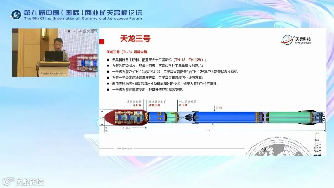 最受关注的当属天兵科技公司的天龙三号火箭方案。直径3.8米,总长71米,起飞质量590吨,起飞推力770吨,近地轨道运力17吨太阳同步轨道运力14吨。