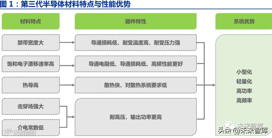 与第一代半导体材料 Si 相比,碳化硅具备更高的击穿电场强度、饱和电子漂移速率、 热导性和热稳定性。根据艾瑞咨询数据:1)宽禁带:高稳定性+高击穿电场强度。碳化硅的禁带宽度是硅的 3 倍,使得其具有 更好的稳定性,宽禁带同时也有助于提高击穿电场强度,使其具有更好的耐热性和耐高压 性、高频性。2)热导率:散热性能好。SiC 热导率是 Si 的 2-3 倍,热阻更低,更耐高温(工作结温 更高可达 200℃以上,极限工作结可达 600℃,而 Si 的工作极限温度为 150℃),产生的 热量更容易传输到散热器和环境中。3)高饱和电子漂移速率:能量损耗更低。碳化硅的饱和电子漂移速率为硅的 2-3 倍, 导通电阻更低,能够大幅度降低导通损耗,同时有更高的切换频率。在 1kV 电压等级下, SiC 基单极性器件的导通电阻是 Si 基器件的 1/60。
